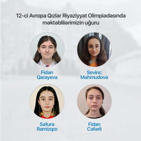 tehsilmedia.info xəbər verir ki, məktəblilərimiz olimpiadada uğurla çıxış edərək 1 qızıl, 1 bürünc medal və 2 "Həvəsləndirici Mükafat” qazanıblar. Belə ki, Elm və Təhsil Nazirliyinin birbaşa tabeliyində olan Fizika, riyaziyyat və informatika təmayüllü liseyin XI sinif şagirdi Fidan Qarayeva qızıl medala, Türkiyə Dəyanət Vəqfi Bakı Türk liseyinin X sinif şagirdi Sevinc Mahmudova bürünc medala, həmin liseyin XI sinif şagirdləri Fidan Cəfərli və Səfurə Ramizqızı isə "Həvəsləndirici Mükafat” sertifikatına layiq görülüblər.