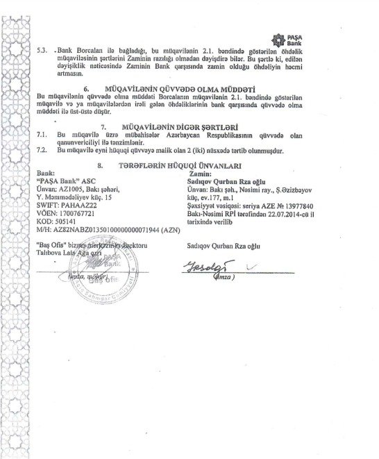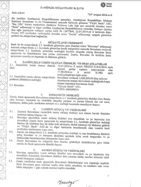 “2000-ci ildən “Göyçay- Şərab” ASC-yə rəhbərlik edirəm. Bu günə qədər müəssisəmizin heç bir banka borcu olmayıb və adı hər hansı məhkəmə çəkişməsində hallanmayıb. Qurban Sadıqov vəzifəsindən sui-istifadə edərək məhkəmələrdə əsassız iddialar qaldırıb, “Göyçay-Şərab” ASC-dən külli miqdarda pul tələb edir. Halbuki özü bizim müəssisənin adına bankdan yüksək məbləğdə kreditə pul götürüb və öz məqsədləri üçün xərcləyib. İndi də həmin pulu bizdən tələb edir. 2016-cı ildə Qurban Sadıqov o vaxt qudası, həm də mənim dostum olan Loğman Məmmədov vasitəsilə mənə yaxınlaşdı. Pula ehtiyacı olduğunu, lakin bankdan kredit götürməkdə çətinlik çəkdiyini bildirdi. Xahiş etdi ki, “Göyçay- Şarab” ASC-nin adına kredit götürülüb ona verilsin. Hətta “Paşa Bank”ASC-də özünün tanışları olduğunu dedi. Müəsssisəmisin adına götürdüyü kreditin müqabilində isə “Göyçay-Şərab” ASC-nin Nazirlar Kabineti səviyyəsində biznesinin genişləndiriləcəyinə vədlər verdi. Kreditin ödənilməsində heç bir problemin yaranmayacağını, özünün zamin olacağını və banka vaxtı-vaxtında pulu qaytaracağını dedi. Hətta bunun üçün ailasinə və qohumlarına məxsus 6 daşınmaz amlakı da kreditin taminatı kimi banka ipoteka qoyacağını söylədi. Mənim iştirakım olmadan “Paşa Bank”ın Bakıxanov küçəsi, Bridge Plazada yerləşən filialına gedib və kreditin bütün şərtləri ilə razılaşıb”.