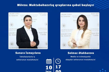 İyulun 10-da saat 17:00-da 2024-2025-ci tədris ili üzrə ümumi təhsil müəssisələrinin məktəbəhazırlıq qruplarına qəbul üçün qeydiyyatla bağlı məsələlər müzakirə olunacaq. Canlı yayımda valideynləri maraqlandıran suallar cavablandırılacaq.