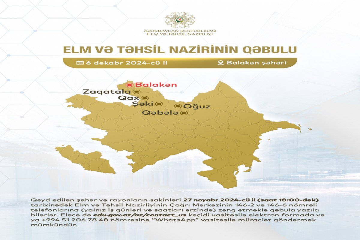 Adları çəkilən şəhər və rayonların sakinləri 27 noyabr (saat 18:00-dək) tarixinədək Elm və Təhsil Nazirliyinin Çağrı Mərkəzinin 146 – 2 və 146 – 6 nömrəli telefonlarına (yalnız iş günləri və saatları ərzində) zəng etməklə qəbula yazıla bilərlər. Bununla yanaşı, nazirliyin rəsmi saytının //edu.gov.az/az/contact_us bölməsinə elektron formada və ya +994 51 206 78 48 nömrəsinə “WhatsApp” vasitəsilə müraciət göndərmək mümkündür.
