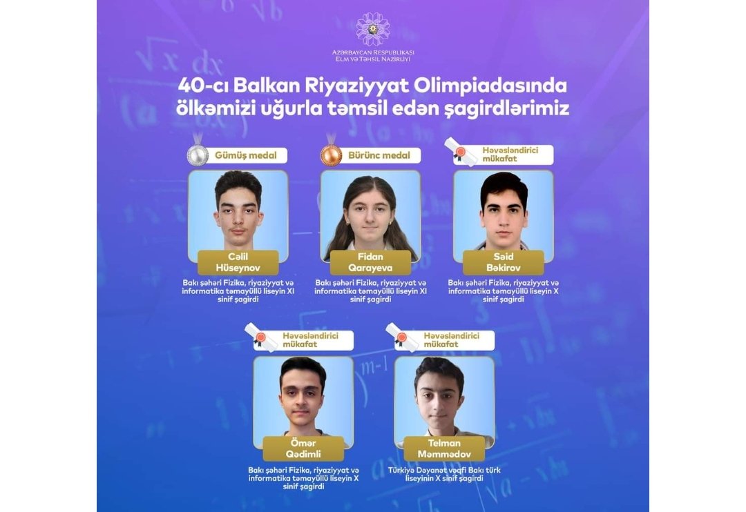 Qeyd edək ki, 2007-ci ildən etibarən Balkan Riyaziyyat Olimpiadasında iştirak edən məktəblilərimiz ümumilikdə 1 qızıl, 17 gümüş və 36 bürünc medal qazanıblar.