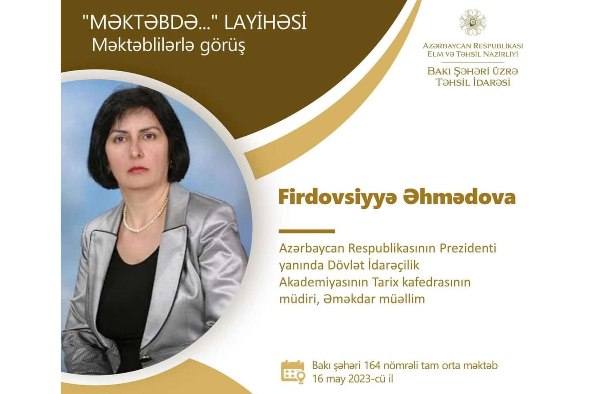 tehsilmedia.info xəbər verir ki, Bakı Şəhəri üzrə Təhsil İdarəsi tərəfindən reallaşdırılan layihənin budəfəki qonağı Azərbaycan Respublikasının Prezidenti yanında Dövlət İdarəçilik Akademiyasının Tarix kafedrasının müdiri, tarix üzrə fəlsəfə doktoru, dosent, əməkdar müəllim Firdovsiyyə Əhmədova olacaq.