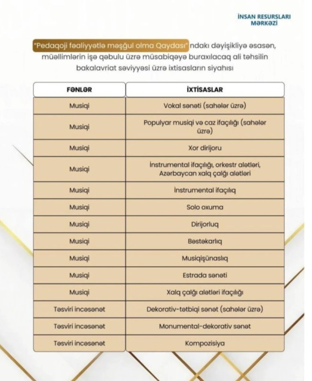 Nəzərinizə çatdırırıq ki, hər il müsabiqəyə buraxılacaq ixtisasların siyahısı “Pedaqoji fəaliyyətlə məşğul olma Qaydası”nın əlavəsində qeyd edilən ixtisaslara müvafiq olaraq müəyyənləşdirilir.