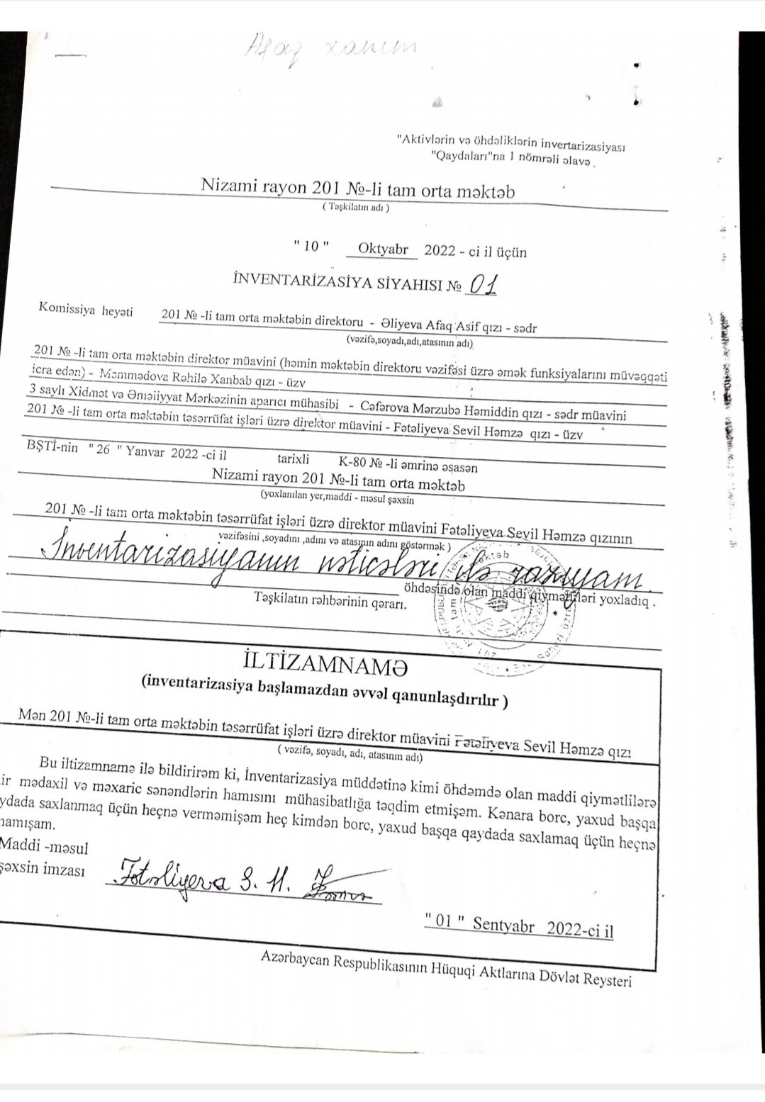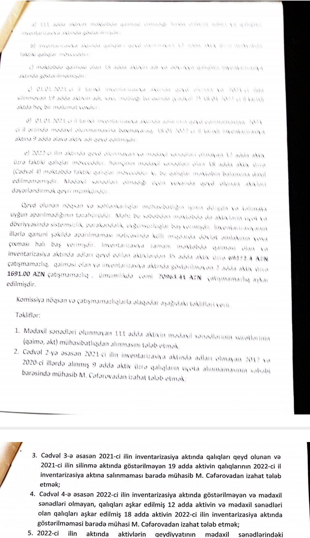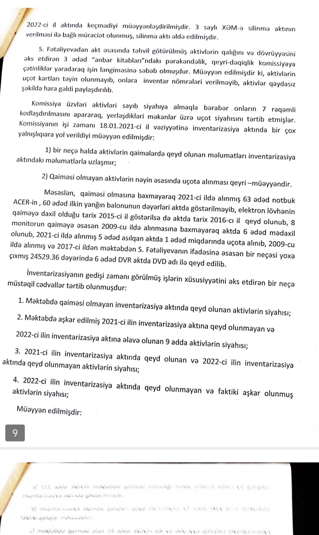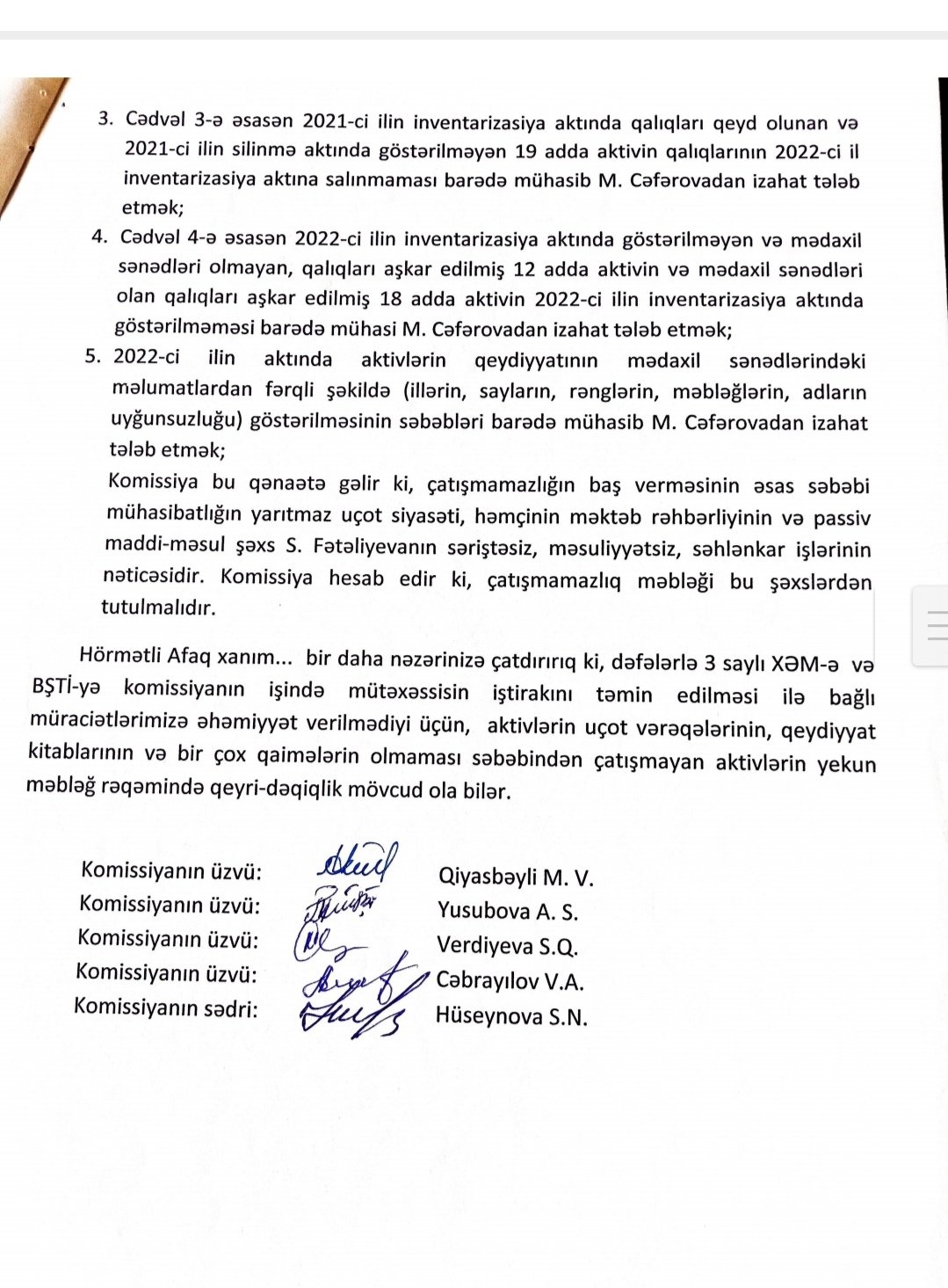 S.Hüseynovanın adı BŞTİ-nin 80 N-li əmrində olmamasna baxmayaraq qanunsuz şəkildə inventarizasiya aktına salınıb və imza etdirilib. Maliyyə Nazirliyinin müəyyən etdiyi qanunlara əsasən inventarizasiya müəssisələrdə 5 N-li əlavədə göstərilmiş forma üzrə aparılmalıdır. Afaq Əliyeva isə özündən icad etdiyi "QALIQ DƏYƏRİ", "SİLİNMƏ" sütunları olan forma yaradıb. Bu yolla da vəsaitin silinməsini həyata keçirib. Afaq Əliyevanın bu hərəkəti qaydaların ziddinə aparılan qanunsuz bir əməliyyatdır. Nəticədə 2017-ci ildən məktəbdən yoxa çıxan, lakin var olan kimi göstərilən 53000 min manatlıq vəsaitlər əsassız olaraq silinmə, qüsur və ləğv etmə aktı tərtib edilmədən balansdan silinib. Bu isə ciddi maliyyə pozuntusudur. İlkin dəyəri 53000 min manatlıq dövlət əmlakının talanmasının rəsmiləşdirilməsidir. Afaq Əliyeva oğurluq faktı barəsində rəsmi hesabat aldığı andan hüquq mühafizə orqanlarına dərhal məlumat verməli idi. O isə bu faktı gizlətməyi qərara alıb və məlumat vermək əvəzinə həmin əmlakı qanunsuz şəkildə məktəbin balansından silib. İnventarizasiyanın aparılması qaydalarında dəqiq göstərilib ki, çatışmazlığın dəyəri cavabdehlərdən avadanlığın ilkin alınma dəyəri ilə deyil, avadanlığın çatışmazlıq barəsində müəyyən edildiyi tarixdəki bazar qiyməti ilə tutulmalıdır. Yəni 2017-ci ildə 53000 min manat çatışmazlığın 2022-ci ildə bazar qiyməti təxminən 150-200 min manat məbləğində olub və bu qaydada hesablanmalıdır. Nazirlər Kabinetinin əsas vəsaitlərin silinməsi haqda Qaydalarında müəyyən edilib ki, 10 il ərzində oğurlanan, itən vəsaitlər haqda Daxili İşlər Nazirliyinin arayışı olmadan heç bir silinmə aparıla bilməz. Yəni 2022-də DİN-ə məlumat verilsəydi, silinmə 2032-də aparılmalı idi. Görünən odur ki, Afaq Əliyevanın qanunsuz əməlləri saymaqla bitmir və bütün bunlar onun haqqında ciddi araşdırılmalara başlamağı və vacib ölçü götürməyi tələb edir. Əks halda bu şəxsin vəzifədə qalması nəinki sözügedən məktəbin imicinə, eləcə də Təhsil Nazirliyinin və ümumilikdə dövlətin mənafeyini ciddi zərbə vurur. Bu səbəbdən də yuxarıda qeyd olunan faktların araşdırılması, dövlətə vurulmuş ziyanın dəqiq məbləğinin müəyyən edilməsi məqsədilə maliyyə yoxlamasının, maliyyə ekspertizasının təyin edilməsi zəruridir.