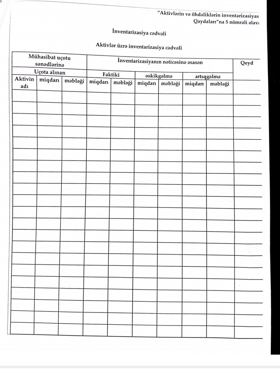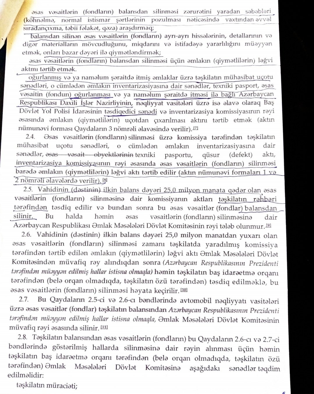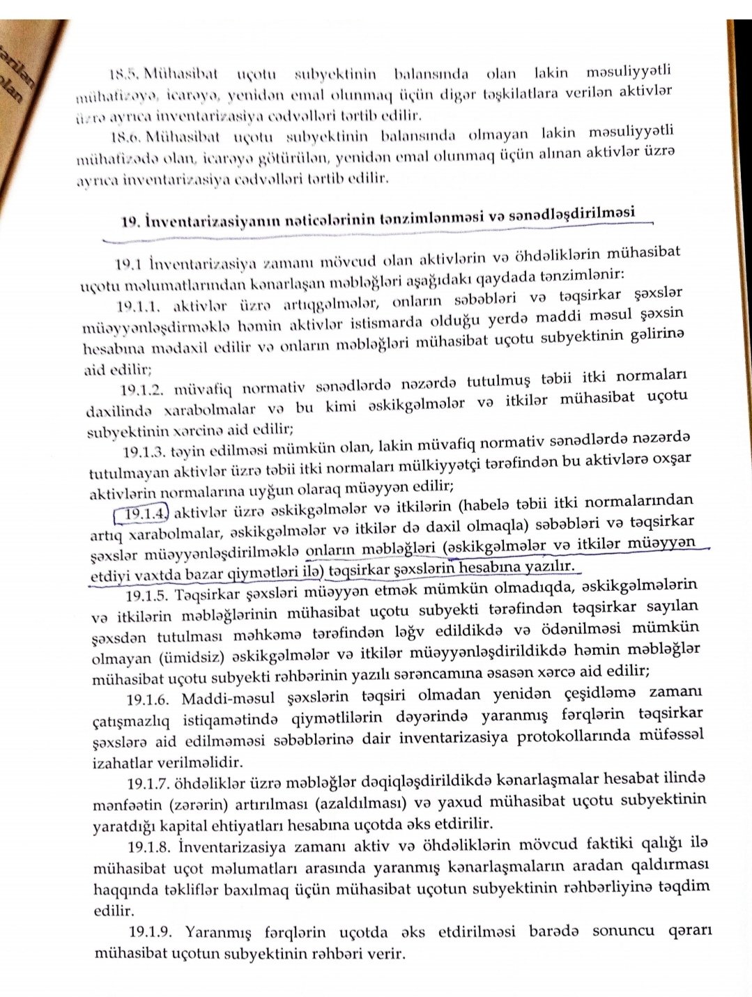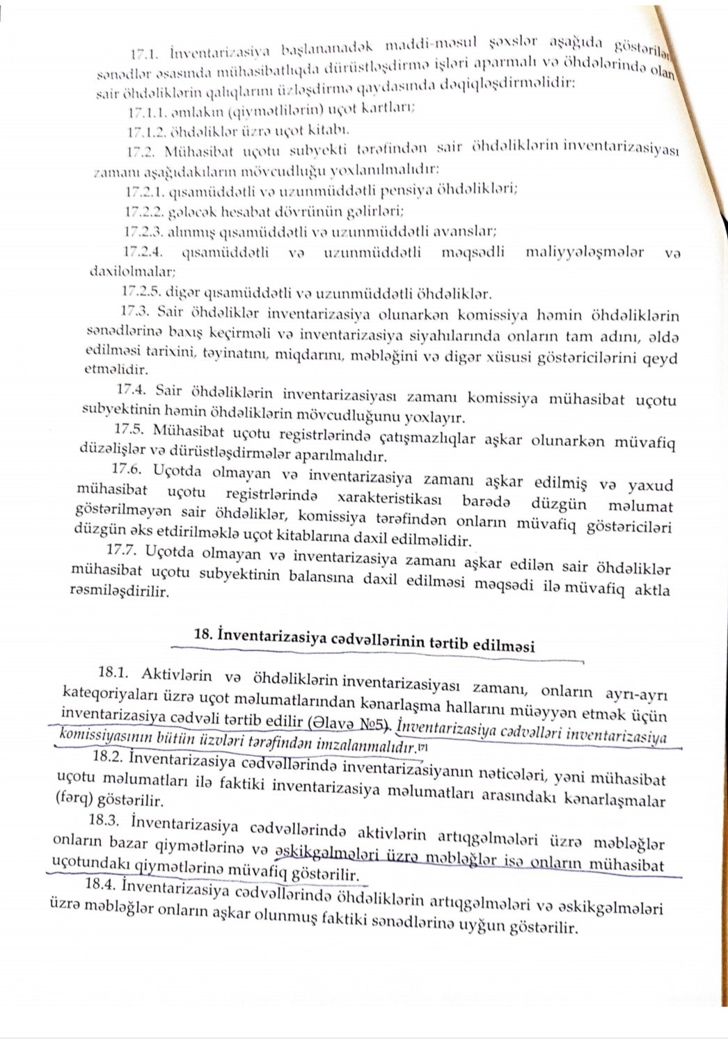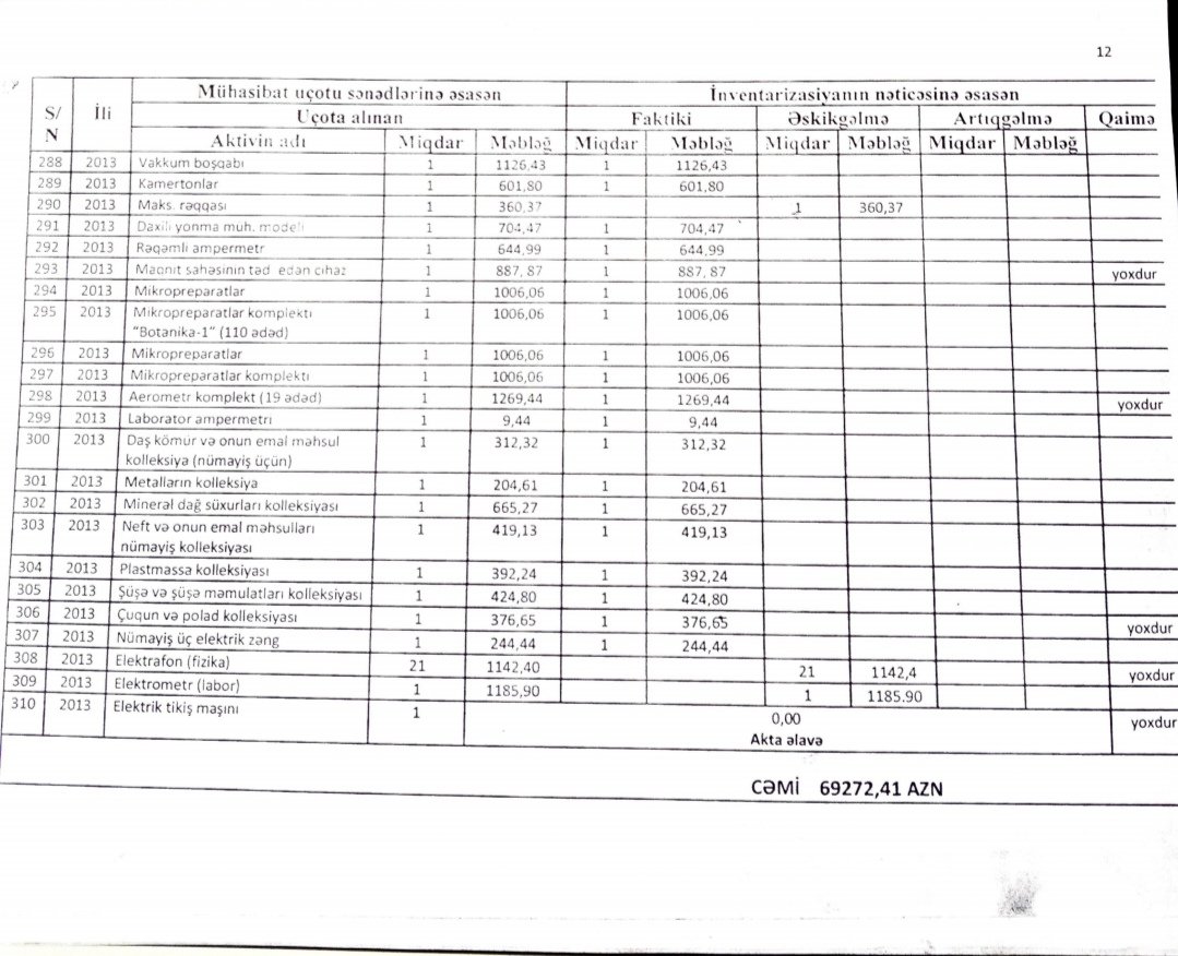 S.Hüseynovanın adı BŞTİ-nin 80 N-li əmrində olmamasna baxmayaraq qanunsuz şəkildə inventarizasiya aktına salınıb və imza etdirilib. Maliyyə Nazirliyinin müəyyən etdiyi qanunlara əsasən inventarizasiya müəssisələrdə 5 N-li əlavədə göstərilmiş forma üzrə aparılmalıdır. Afaq Əliyeva isə özündən icad etdiyi "QALIQ DƏYƏRİ", "SİLİNMƏ" sütunları olan forma yaradıb. Bu yolla da vəsaitin silinməsini həyata keçirib. Afaq Əliyevanın bu hərəkəti qaydaların ziddinə aparılan qanunsuz bir əməliyyatdır. Nəticədə 2017-ci ildən məktəbdən yoxa çıxan, lakin var olan kimi göstərilən 53000 min manatlıq vəsaitlər əsassız olaraq silinmə, qüsur və ləğv etmə aktı tərtib edilmədən balansdan silinib. Bu isə ciddi maliyyə pozuntusudur. İlkin dəyəri 53000 min manatlıq dövlət əmlakının talanmasının rəsmiləşdirilməsidir. Afaq Əliyeva oğurluq faktı barəsində rəsmi hesabat aldığı andan hüquq mühafizə orqanlarına dərhal məlumat verməli idi. O isə bu faktı gizlətməyi qərara alıb və məlumat vermək əvəzinə həmin əmlakı qanunsuz şəkildə məktəbin balansından silib. İnventarizasiyanın aparılması qaydalarında dəqiq göstərilib ki, çatışmazlığın dəyəri cavabdehlərdən avadanlığın ilkin alınma dəyəri ilə deyil, avadanlığın çatışmazlıq barəsində müəyyən edildiyi tarixdəki bazar qiyməti ilə tutulmalıdır. Yəni 2017-ci ildə 53000 min manat çatışmazlığın 2022-ci ildə bazar qiyməti təxminən 150-200 min manat məbləğində olub və bu qaydada hesablanmalıdır. Nazirlər Kabinetinin əsas vəsaitlərin silinməsi haqda Qaydalarında müəyyən edilib ki, 10 il ərzində oğurlanan, itən vəsaitlər haqda Daxili İşlər Nazirliyinin arayışı olmadan heç bir silinmə aparıla bilməz. Yəni 2022-də DİN-ə məlumat verilsəydi, silinmə 2032-də aparılmalı idi. Görünən odur ki, Afaq Əliyevanın qanunsuz əməlləri saymaqla bitmir və bütün bunlar onun haqqında ciddi araşdırılmalara başlamağı və vacib ölçü götürməyi tələb edir. Əks halda bu şəxsin vəzifədə qalması nəinki sözügedən məktəbin imicinə, eləcə də Təhsil Nazirliyinin və ümumilikdə dövlətin mənafeyini ciddi zərbə vurur. Bu səbəbdən də yuxarıda qeyd olunan faktların araşdırılması, dövlətə vurulmuş ziyanın dəqiq məbləğinin müəyyən edilməsi məqsədilə maliyyə yoxlamasının, maliyyə ekspertizasının təyin edilməsi zəruridir.