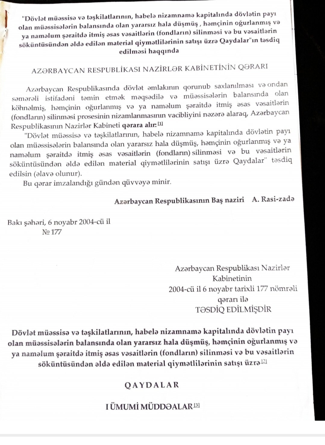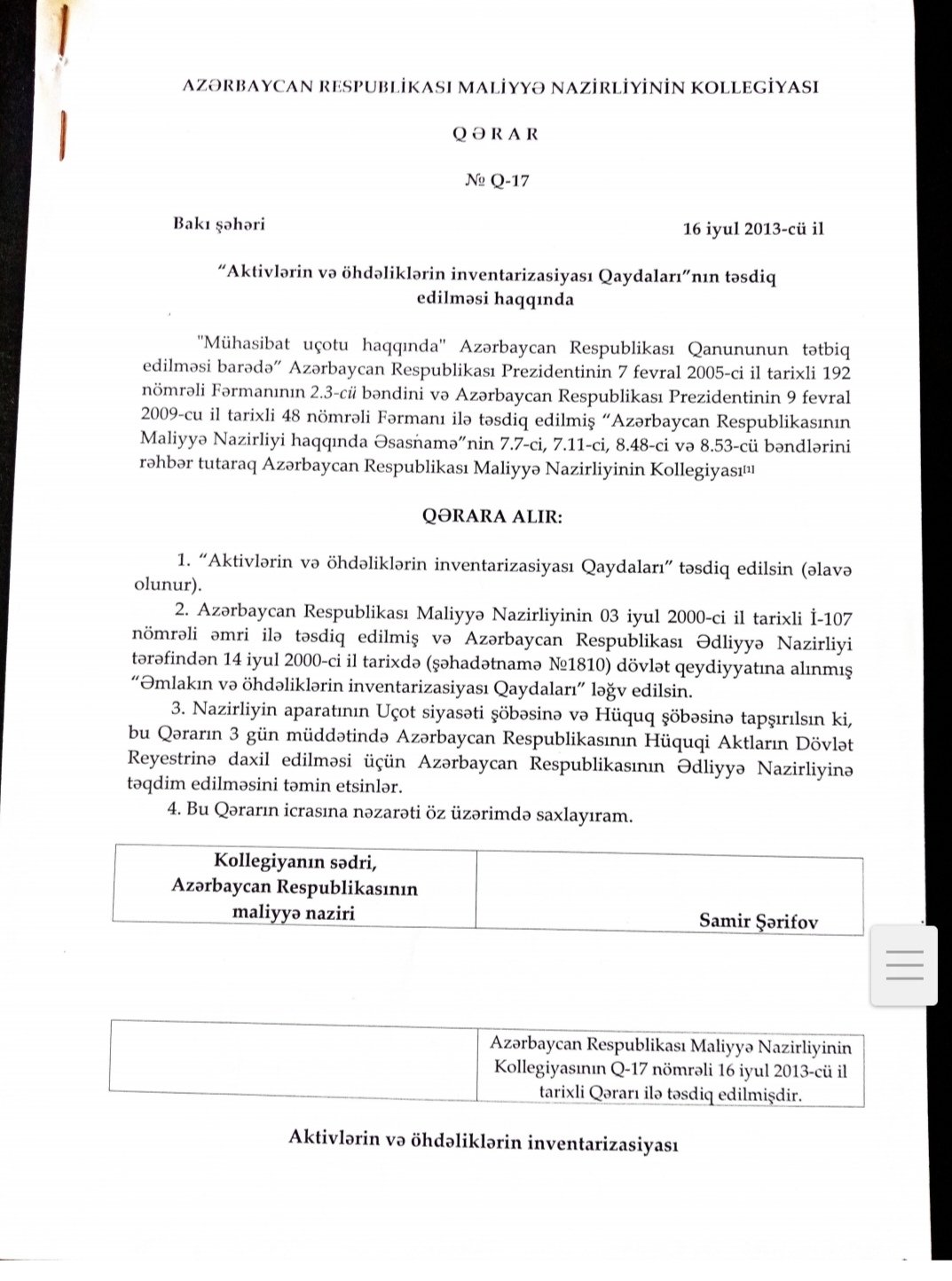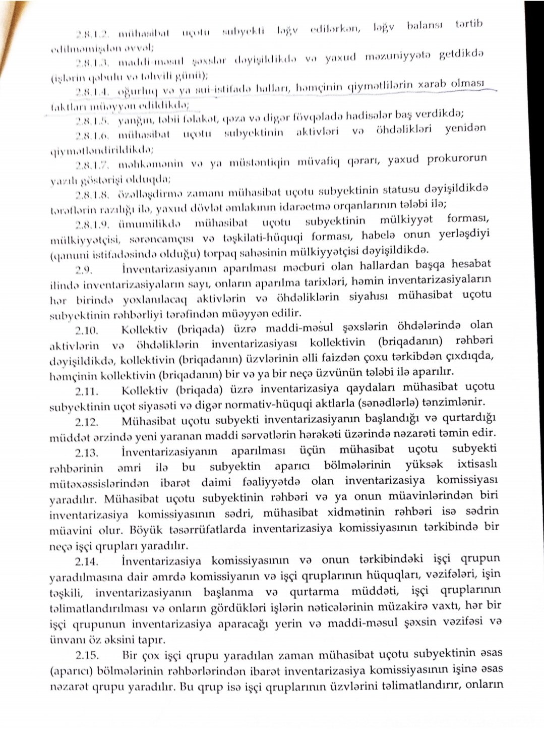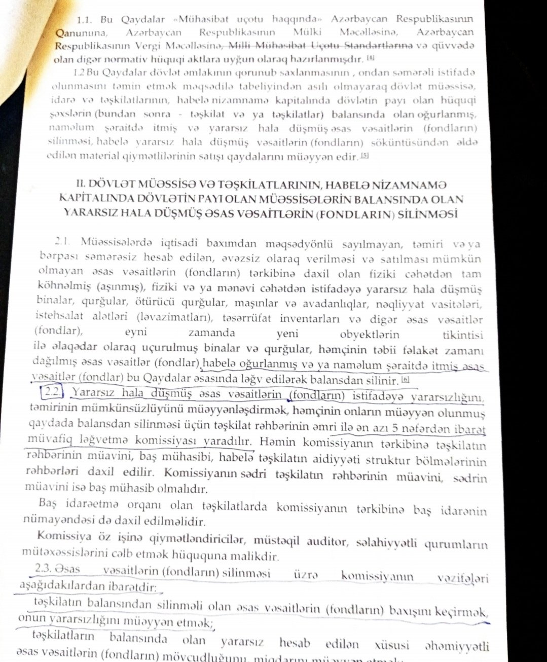 S.Hüseynovanın adı BŞTİ-nin 80 N-li əmrində olmamasna baxmayaraq qanunsuz şəkildə inventarizasiya aktına salınıb və imza etdirilib. Maliyyə Nazirliyinin müəyyən etdiyi qanunlara əsasən inventarizasiya müəssisələrdə 5 N-li əlavədə göstərilmiş forma üzrə aparılmalıdır. Afaq Əliyeva isə özündən icad etdiyi "QALIQ DƏYƏRİ", "SİLİNMƏ" sütunları olan forma yaradıb. Bu yolla da vəsaitin silinməsini həyata keçirib. Afaq Əliyevanın bu hərəkəti qaydaların ziddinə aparılan qanunsuz bir əməliyyatdır. Nəticədə 2017-ci ildən məktəbdən yoxa çıxan, lakin var olan kimi göstərilən 53000 min manatlıq vəsaitlər əsassız olaraq silinmə, qüsur və ləğv etmə aktı tərtib edilmədən balansdan silinib. Bu isə ciddi maliyyə pozuntusudur. İlkin dəyəri 53000 min manatlıq dövlət əmlakının talanmasının rəsmiləşdirilməsidir. Afaq Əliyeva oğurluq faktı barəsində rəsmi hesabat aldığı andan hüquq mühafizə orqanlarına dərhal məlumat verməli idi. O isə bu faktı gizlətməyi qərara alıb və məlumat vermək əvəzinə həmin əmlakı qanunsuz şəkildə məktəbin balansından silib. İnventarizasiyanın aparılması qaydalarında dəqiq göstərilib ki, çatışmazlığın dəyəri cavabdehlərdən avadanlığın ilkin alınma dəyəri ilə deyil, avadanlığın çatışmazlıq barəsində müəyyən edildiyi tarixdəki bazar qiyməti ilə tutulmalıdır. Yəni 2017-ci ildə 53000 min manat çatışmazlığın 2022-ci ildə bazar qiyməti təxminən 150-200 min manat məbləğində olub və bu qaydada hesablanmalıdır. Nazirlər Kabinetinin əsas vəsaitlərin silinməsi haqda Qaydalarında müəyyən edilib ki, 10 il ərzində oğurlanan, itən vəsaitlər haqda Daxili İşlər Nazirliyinin arayışı olmadan heç bir silinmə aparıla bilməz. Yəni 2022-də DİN-ə məlumat verilsəydi, silinmə 2032-də aparılmalı idi. Görünən odur ki, Afaq Əliyevanın qanunsuz əməlləri saymaqla bitmir və bütün bunlar onun haqqında ciddi araşdırılmalara başlamağı və vacib ölçü götürməyi tələb edir. Əks halda bu şəxsin vəzifədə qalması nəinki sözügedən məktəbin imicinə, eləcə də Təhsil Nazirliyinin və ümumilikdə dövlətin mənafeyini ciddi zərbə vurur. Bu səbəbdən də yuxarıda qeyd olunan faktların araşdırılması, dövlətə vurulmuş ziyanın dəqiq məbləğinin müəyyən edilməsi məqsədilə maliyyə yoxlamasının, maliyyə ekspertizasının təyin edilməsi zəruridir.