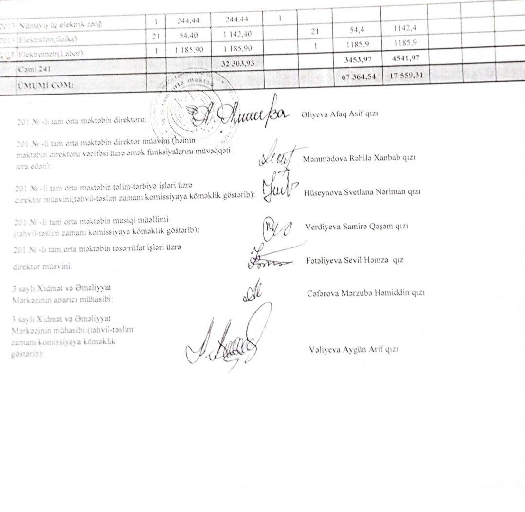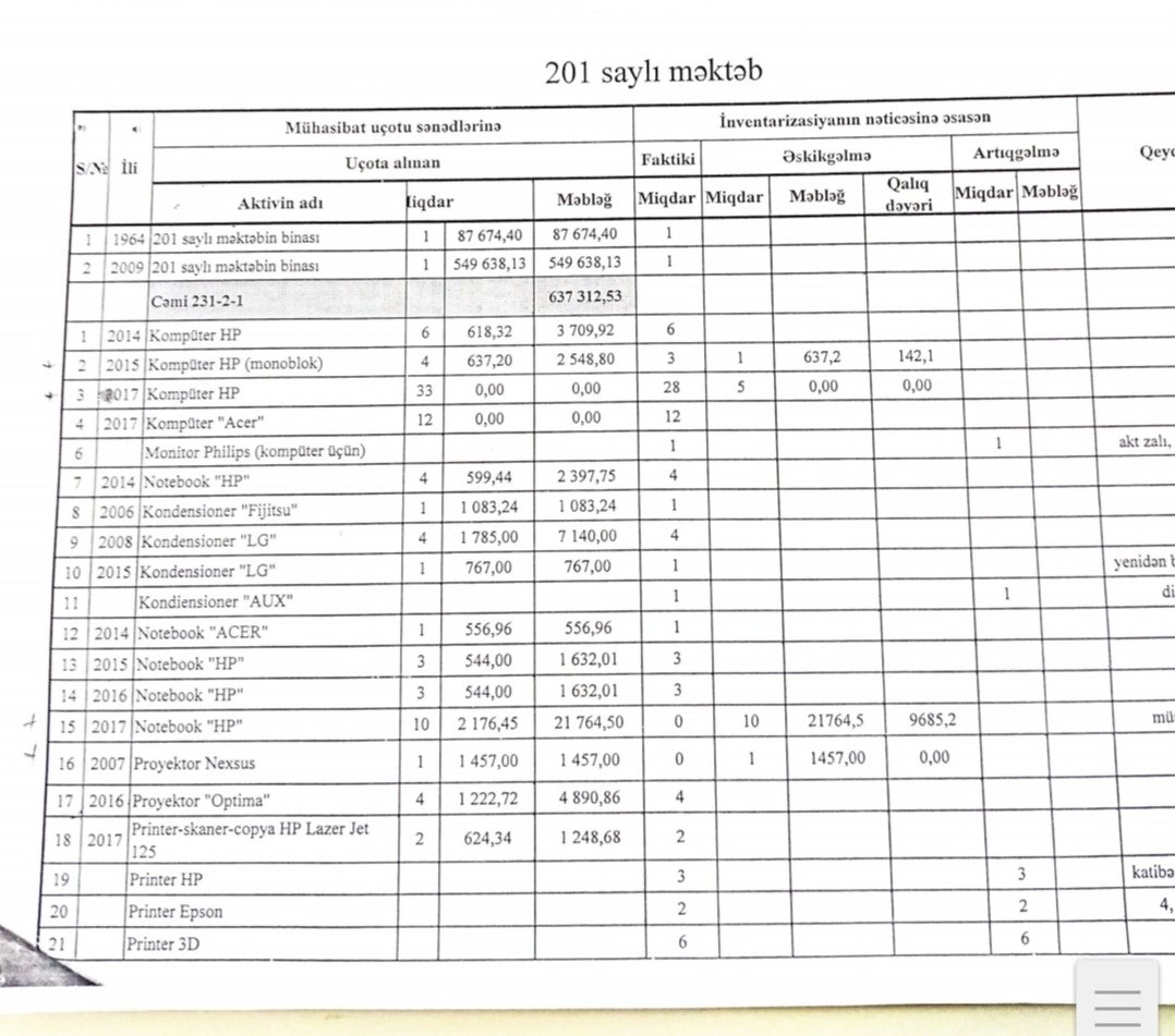Lakin bu da son deyil. Afaq Əliyevanın adı indi də dövlət əmlakının talan edilməsində hallanır. Bu barədə ilginc məlumatlar TəhsilMedia.az saytının redaksiyasına daxil olub. Daxil olan məlumatlara görə, 30.08.2022-ci il tarixli əmrlə 201 nömrəli məktəb üzrə yaradılan inventarizasiya komissiyası təhsil ocağında 70 min 693 manat çatışmazlıq müəyyən edib. Məktəb üzrə məsul şəxs isə təsərrüfat işləri üzrə direktor müavini Sevil Fətəliyeva olub. O, pulun xərcləndiyi İKT avadanlıqlarının 2017-ci ildə məktəbdən oğurlandığını və ya yoxa çıxdığını deyib. Fətəliyeva izahatında bildirib ki, o, həmin vaxt məktəb rəhbərliyindən hüquq mühafizə orqanlarına məlumat verilməsini tələb etsə də, direktor buna qarşı çıxıb. Belə ki, rəhbərlik Sevil Fətəliyevanı hədələyib və onu susmağa məcbur edib.