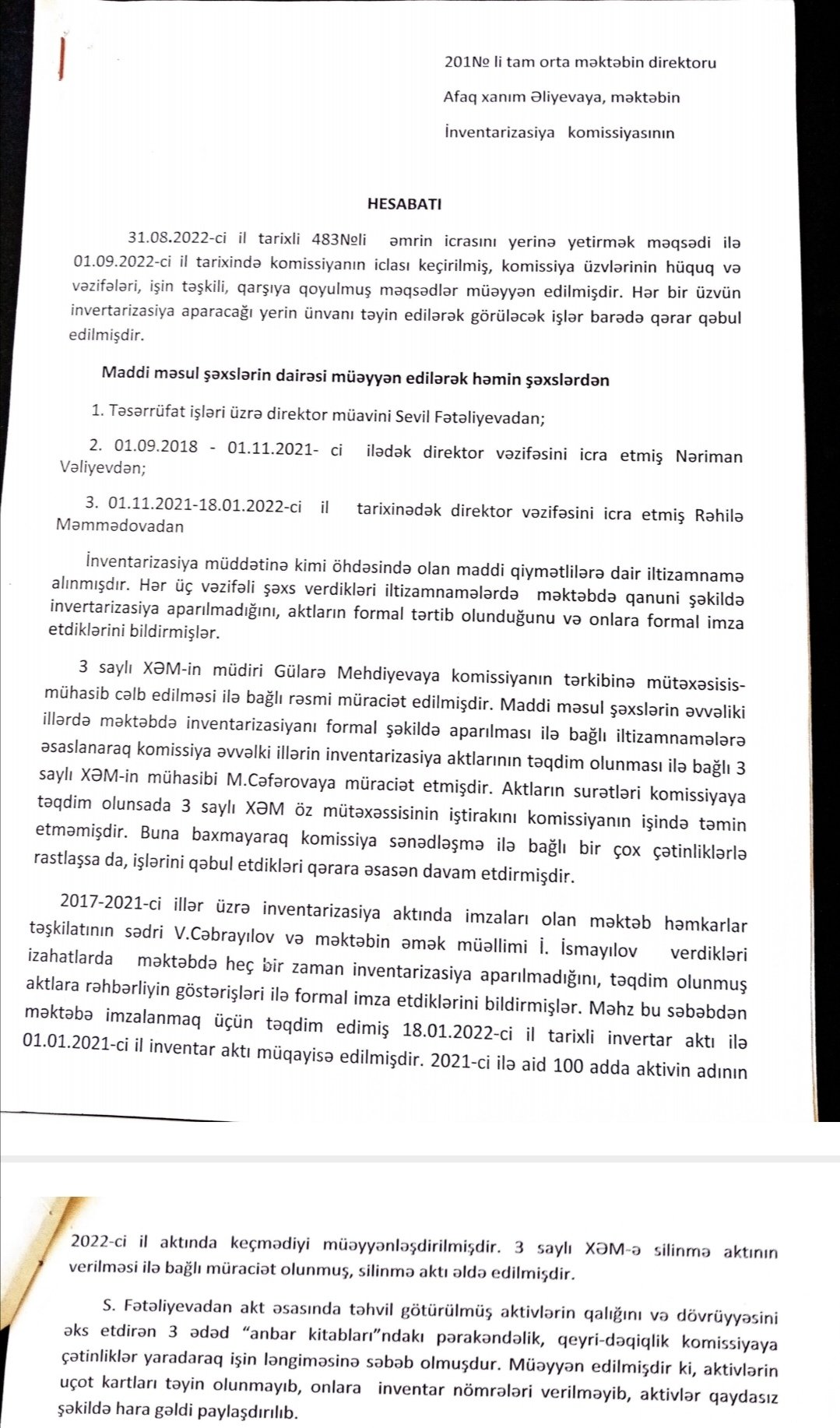 2018-2022-ci illərdə direktor vəzifısini icra edən Nəriman Vəliyev və Rəhilə Məmmədova komissiyaya verdikləri izahatlarında məktəbdə illərlə inventarizasiyanin aparılmadığını, Bakı Şəhər üzrə Təhsil İdarəsinin (BŞTİ) mühasibatlığı tərəfindən tərtib olunan aktlara formal imza atdıqlarını bildiriblər. Ona görə də əvvəlki illərdə çatışmazlıq haqqında məlumat müəyyən edilməyib. Ancaq 30 sentyabr 2022-ci ildə inventarizasiya komissiyasının 5 üzvü və sədr Hüseynova askar edilən catışmazlıqlar barəsində inventarizasiya aktını və hesabatı tərtib edib imzalayıblar. Bundan sonra isə direktor Afaq Əliyevaya təqdim ediblər. Bu hadisədən 10 gün sonra, yəni 10 oktyabr 2022-ci ildə Afaq Əliyeva BŞTİ-nin 80 N-li əmri əsasında yaradılmış komissiya sədri kimi adıçəkilən idarənin mühasibatlığının nümayəndələri ilə birlikdə Maliyyə Nazirliyinin inventarizasiyanın aparılması qaydalarının ziddinə olaraq müəyyən edilmiş formada deyil, fərqli variantda yeni inventarizasiya aktı tərtib edib. Beləcə həmin aktda 70693 min manatlıq çatışmazlıgın 53000 min manatını qanunsuz şəkildə heç bir təsdiqedici sənəd olmadan (heç bir qüsur aktı, ləgvetmə aktı olmadan yeni sütunlar əlavə etməklə ) imzaları ilə rəsmiləşdirərək balansdan silib.