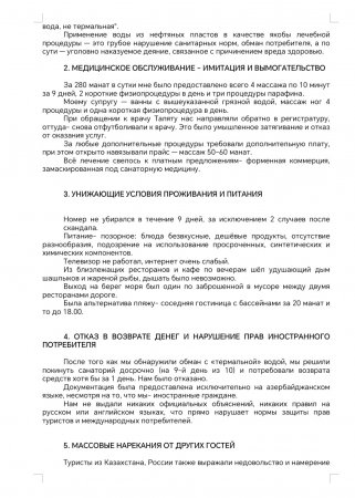 Turist sanatoriyanı bir gün əvvəl tərk etmək istədikdə, ödənilmiş məbləğin geri qaytarılması rədd edilib. Heç bir rus və ya ingilis dilli müqavilə, rəsmi qaydalar təqdim olunmayıb. Bu isə xarici vətəndaşların hüquqlarının açıq şəkildə pozulması deməkdir. Qazaxıstan, Rusiya, Türkiyə və Özbəkistandan gəlmiş digər turistlər də narazılıqlarını ifadə ediblər, bəziləri hətta sanatoriyanı vaxtından əvvəl tərk ediblər.