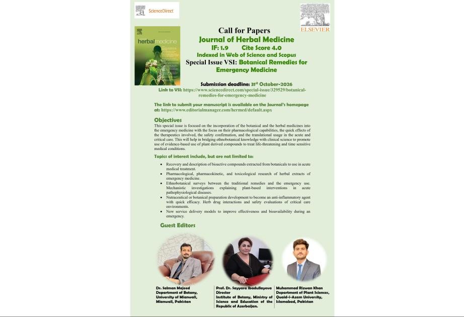 Azərbaycan Respublikası Elm və Təhsil Nazirliyi Botanika İnstitutunun direktoru professor Səyyarə İbadullayeva “Web of Science” və “Scopus” elmi bazalarında indekslənən nəşrin (Journal of Herbal Medicine) xüsusi buraxılışına xarici redaktor (VSI – Guest Editor) təyin olunub.