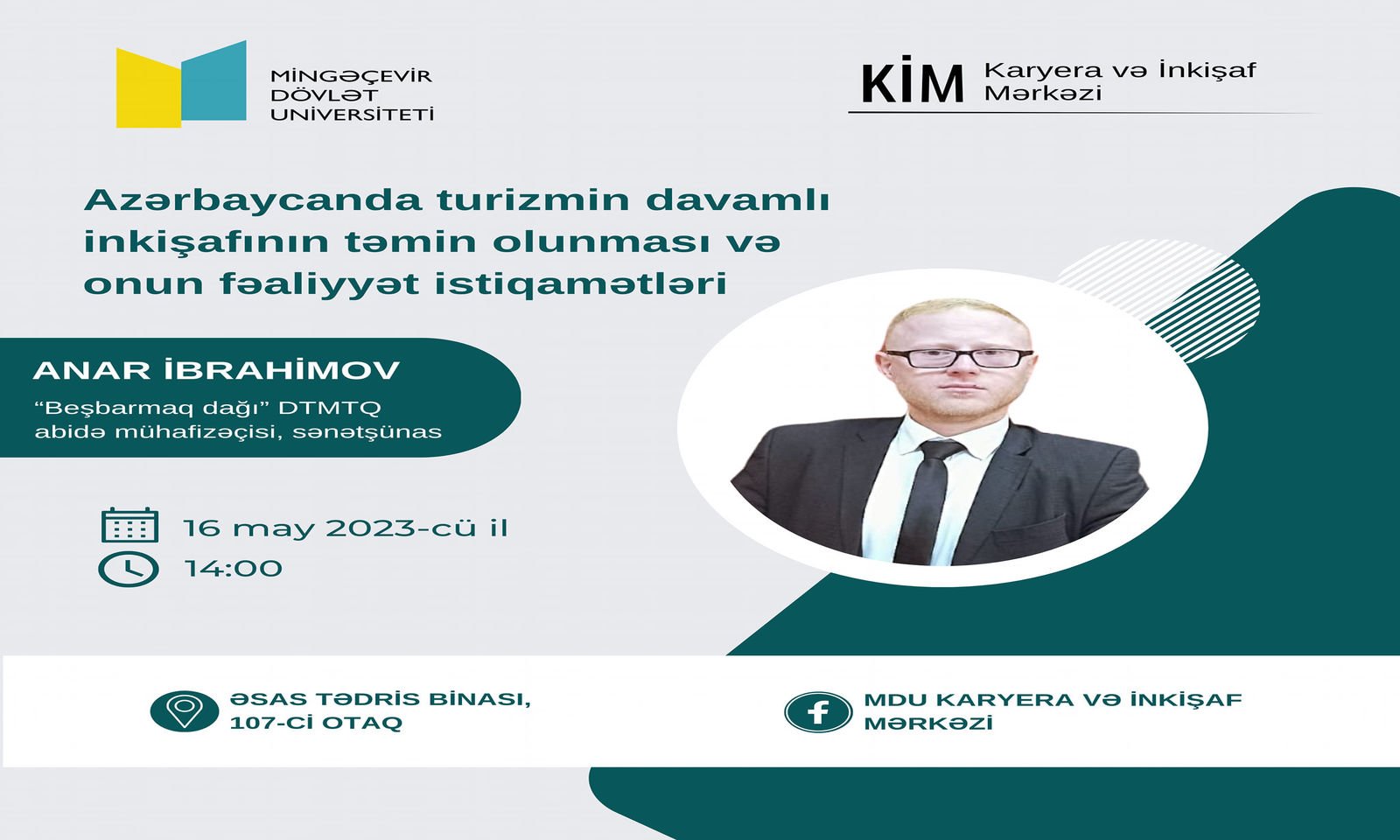 Mingəçevir Dövlət Universitetində (MDU) Karyera və İnkişaf Mərkəzinin (KİM) təşkilatçılığı ilə "Azərbaycanda turizmin davamlı inkişafının təmin olunması və onun fəaliyyət istiqamətləri" mövzusunda seminar keçirilib.