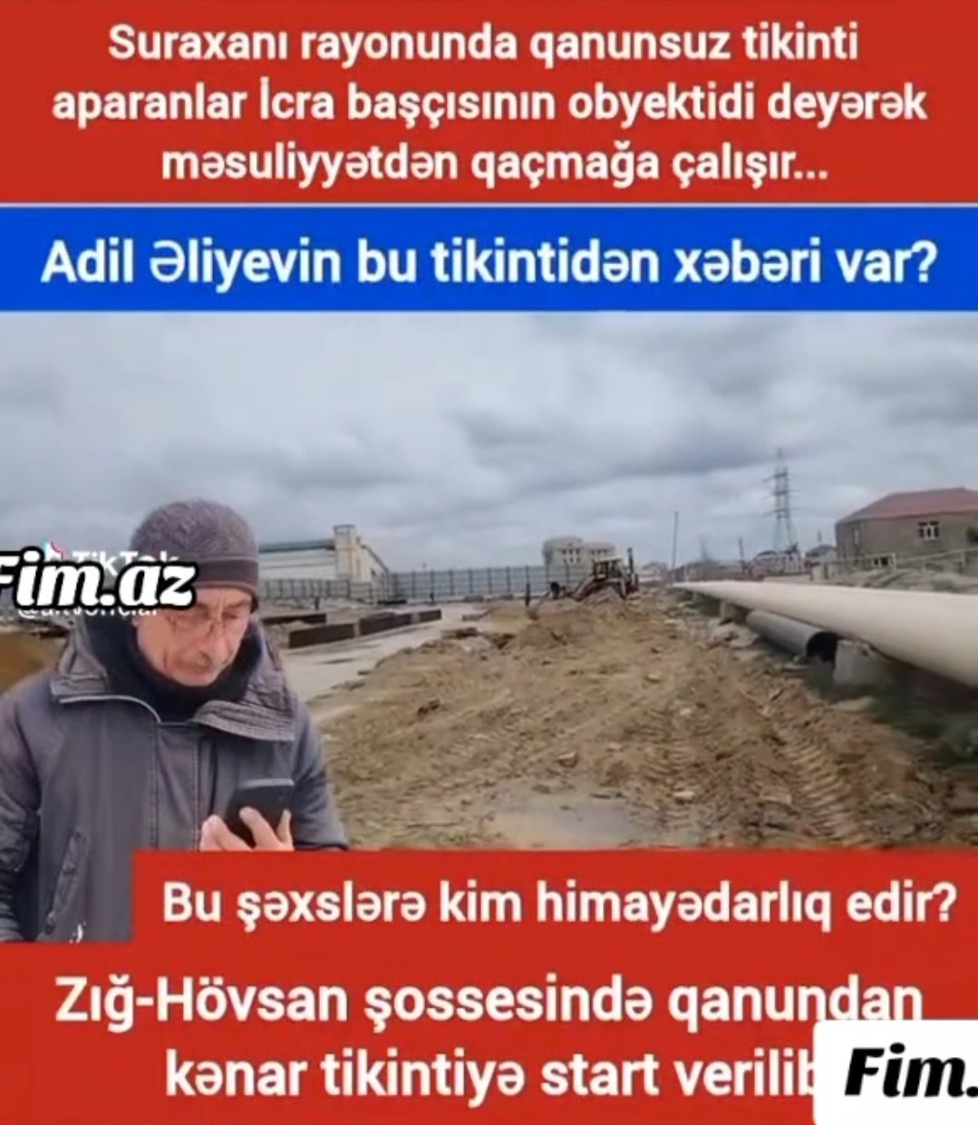 Zığ-Hövsan şossesində qanundan kənar tikintiyə start verilib. Araşdırma aparmaq istədikdə isə Surxanaı rayonunda qanunsuz tikinti aparanlar icra başçısının obyektidir deyərək məsuliyyətdən qaçırlar...
