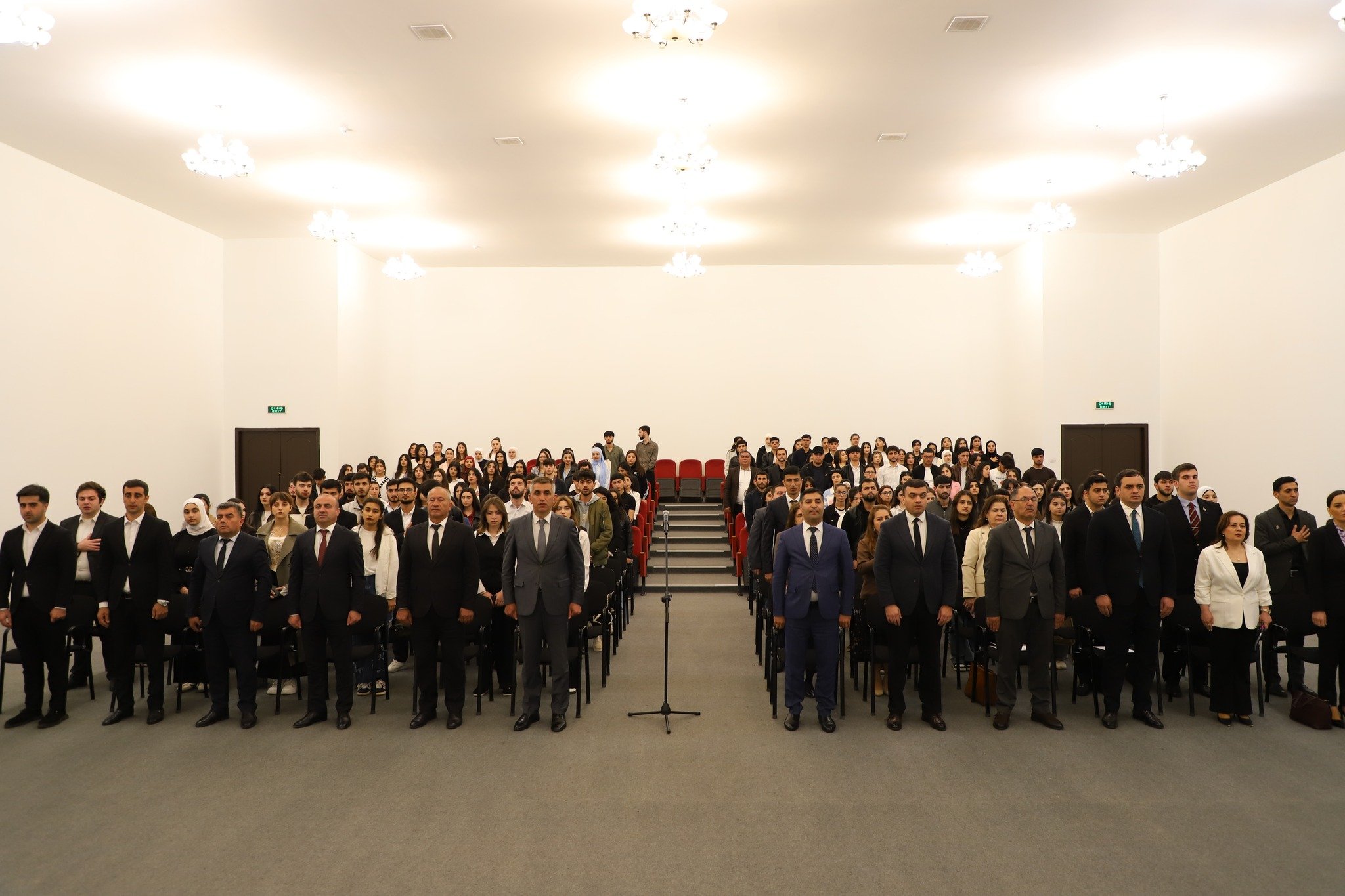 AzEdu.az xəbər verir ki, tədbir Azərbaycan Respublikasının Dövlət Himninin səsləndirilməsi və vətənimizin bütövlüyü uğrunda canlarından keçən şəhidlərin xatirəsinin bir dəqiqəlik sükutla yad edilməsi ilə başlanıb.