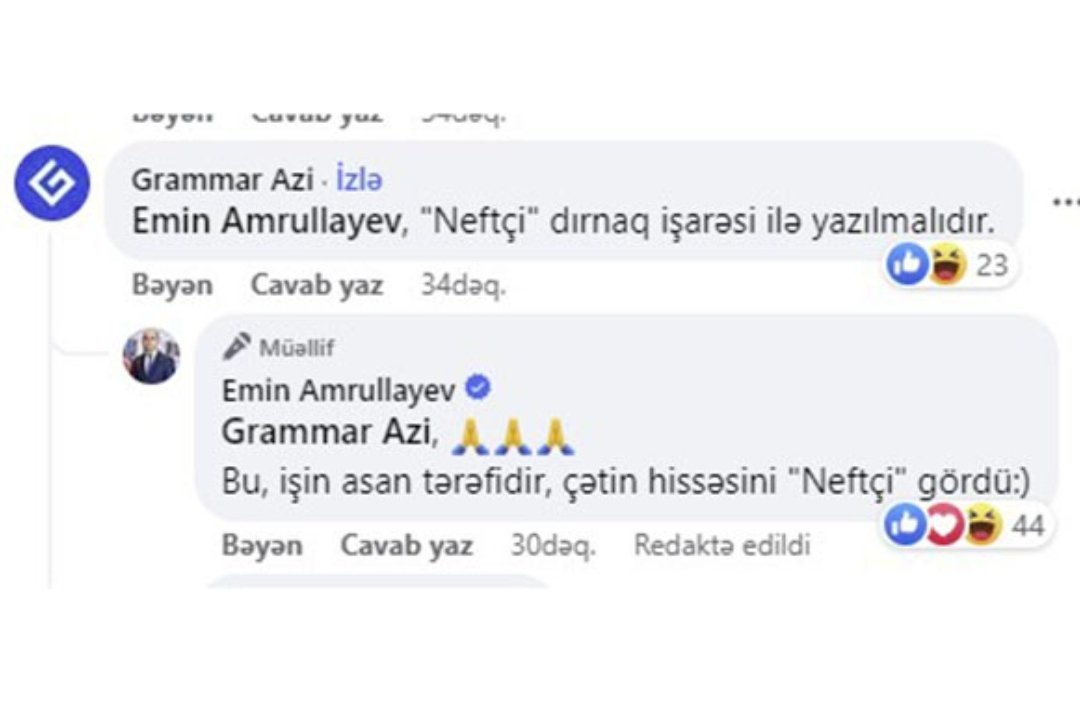 "Grammar Azi" səhifəsi elm və təhsil nazirinin paylaşımına ““Neftçi” dırnaqda yazılmalıdır” deyə irad bildirib. Emin Əmrullayev isə həmin rəyə “bu, işin asan tərəfidir, çətin hissəsini “Neftçi” gördü”” cavabını yazıb.