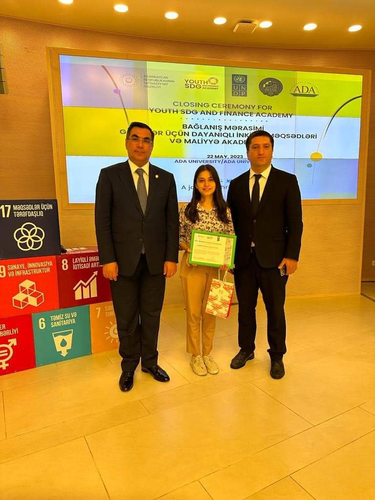 SOCAR-ın Bakı Ali Neft Məktəbinin (BANM) Biznesin idarə edilməsi ixtisasının 2-ci kurs tələbəsi İlahə Hacıyeva Azərbaycan Respublikası İqtisadiyyat Nazirliyi və Birləşmiş Millətlər Təşkilatının İnkişaf Proqramının Azərbaycandakı nümayəndəliyinin birgə təşkilatçılığı ilə keçirilən “Azərbaycan üçün neftdənkənar dayanıqlı, inteqrasiya olunmuş və gender əsaslı maliyyə” layihəsi çərçivəsində “Gənclər üçün Dayanıqlı İnkişaf məqsədləri və Maliyyə Akademiyası” təlim proqramının ən uğurlu iştirakçısı olub.