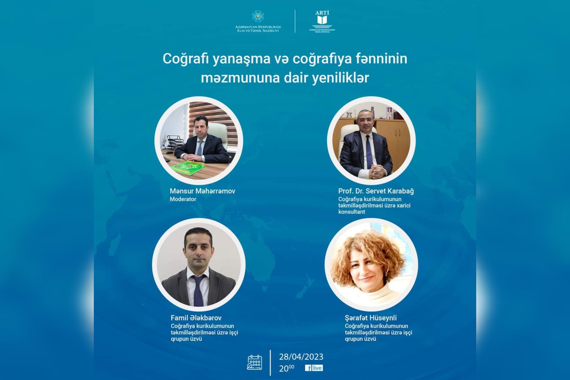 28 aprel tarixində saat 20:00-da Təhsil İnstitutu (ARTİ) Təhsil standartları və proqramları şöbəsinin müdiri Mənsur Məhərrəmovun moderatorluğu ilə "Coğrafi yanaşma və coğrafiya fənninin məzmununa dair yeniliklər” adlı vebinar baş tutacaq.