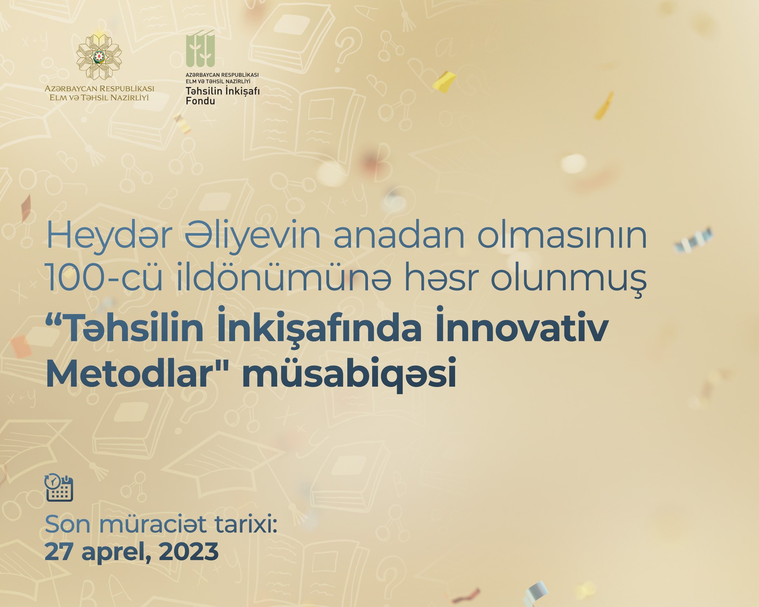 tehsilmedia.info xəbər verir ki,Təhsilin İnkişafı Fondu ümummilli lider Heydər Əliyevin anadan olmasının 100-cü ildönümünə həsr olunmuş "Təhsilin İnkişafında İnnovativ Metodlar” müsabiqəsini elan edir.