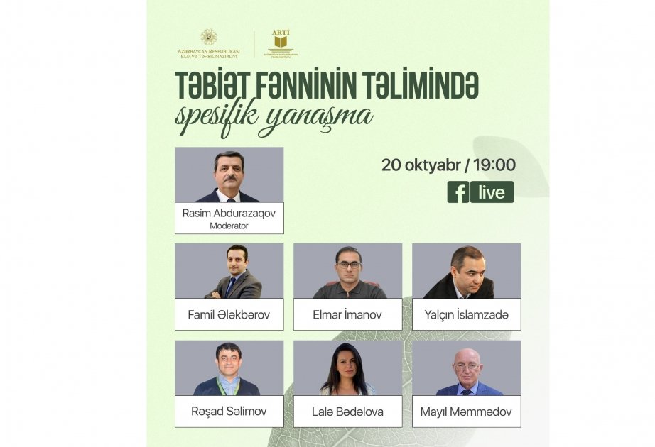 Oktyabrın 20-də Təhsil İnstitutunun Tədris resursları şöbəsinin müdiri Rasim Abdurazaqovun moderatorluğu ilə “Təbiət fənninin təlimində spesifik yanaşma” mövzusunda vebinar keçiriləcək.