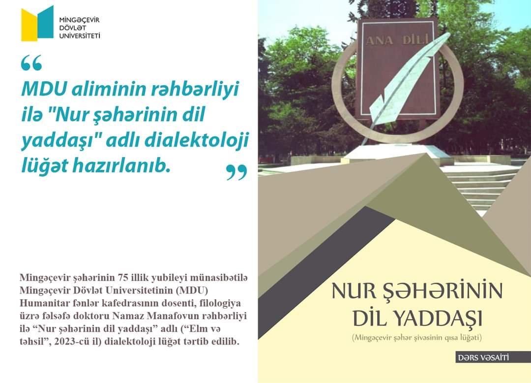 Mingəçevir şəhərinin 75 illik yubileyi münasibətilə Mingəçevir Dövlət Universitetinin (MDU) Humanitar fənlər kafedrasının dosenti, filologiya üzrə fəlsəfə doktoru Namaz Manafovun rəhbərliyi ilə “Nur şəhərinin dil yaddaşı” adlı (“Elm və təhsil”, 2023-cü il) dialektoloji lüğət tərtib edilib.