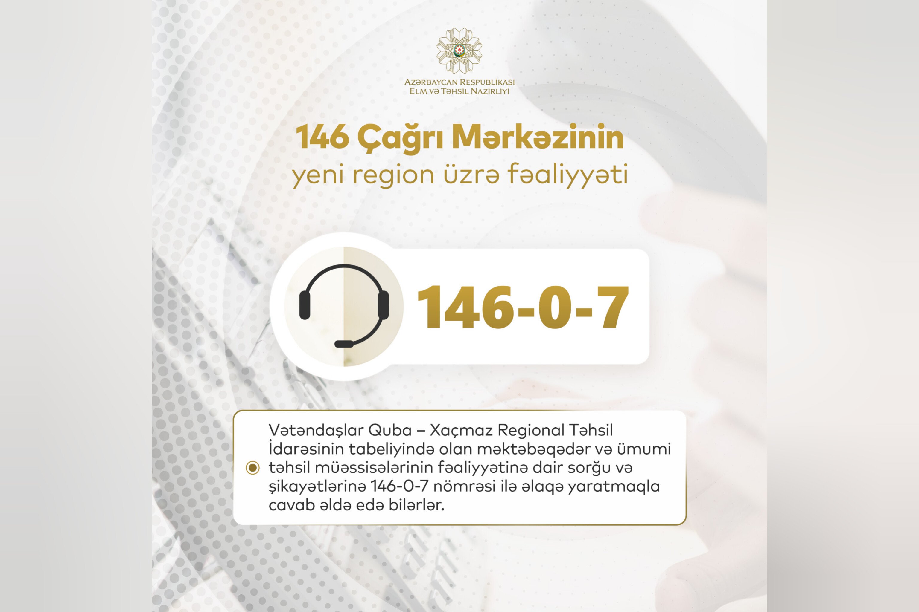 Elm və Təhsil Nazirliyinin 146 Çağrı Mərkəzi yeni region üzrə vətəndaşların sorğularını cavablandıracaq.