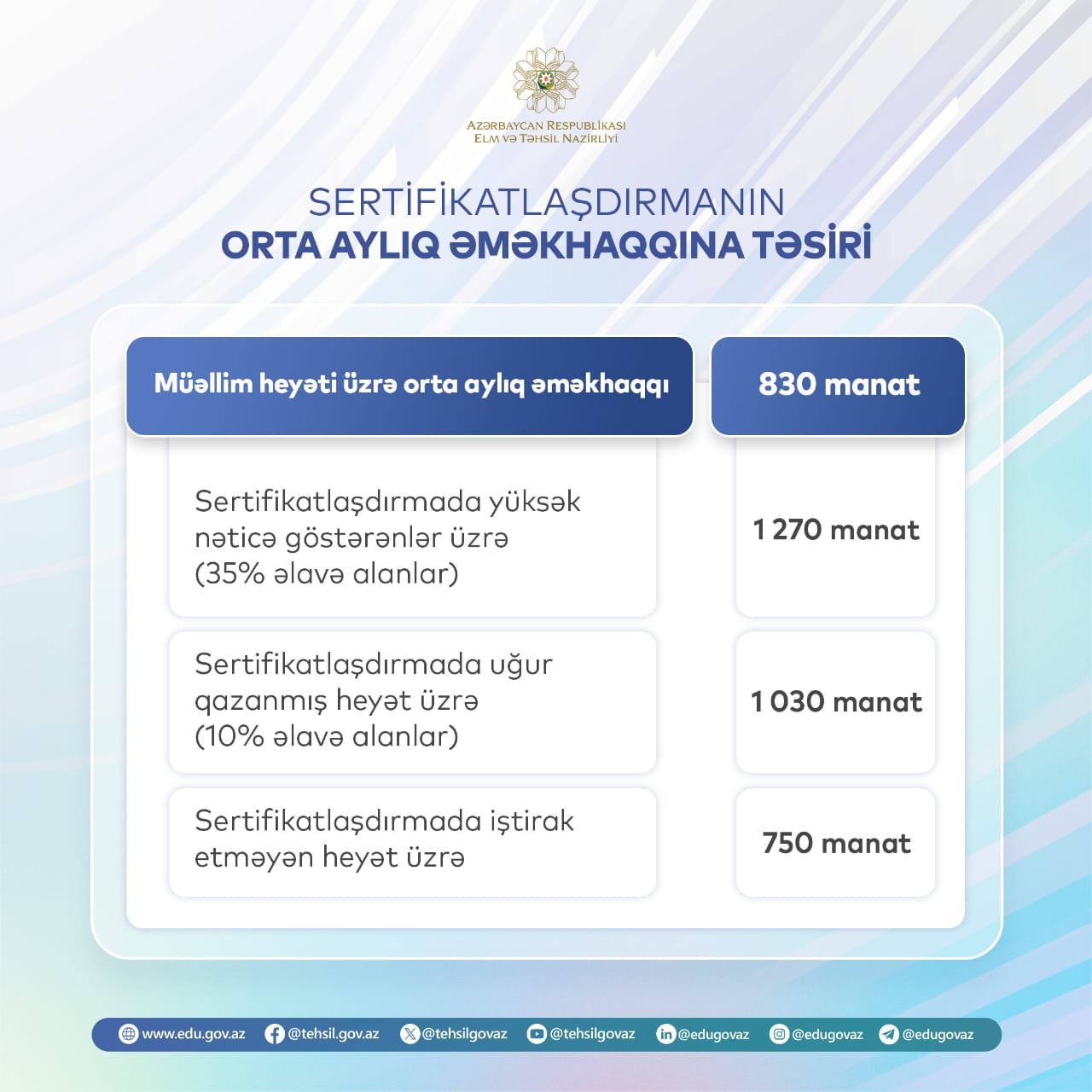Son 2 il ərzində keçirilən sertifikatlaşdırma imtahanlarının nəticələrinə əsasən, 2023-cü ilin IV rübü üzrə təhsilverənlərin orta aylıq əməkhaqqısı 830 manata çatacaq.