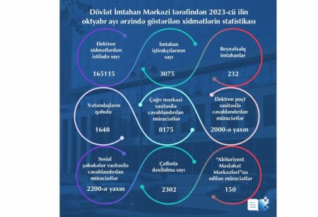 Mərkəzdən "tehsilmedia.info" a bildirilib ki, oktyabr ayında keçirilmiş imtahanlarda 3075 nəfər iştirak edib. Mərkəzin elektron xidmətlərindən istifadə sayı 165 min 115 olub. Oktyabr ayı ərzində 1648 vətəndaş qəbul edilib. Beynəlxalq imtahanlarda 232 nəfər iştirak edib. Çağrı Mərkəzi vasitəsilə 8175, elektron poçt vasitəsilə 2000-ə yaxın, sosial şəbəkələr vasitəsilə 2200-ə yaxın müraciət cavablandırılıb. Çatbota daxilolma sayı 2302 olub. Abituriyent məsləhət mərkəzlərinə 150 müraciət daxil olub.