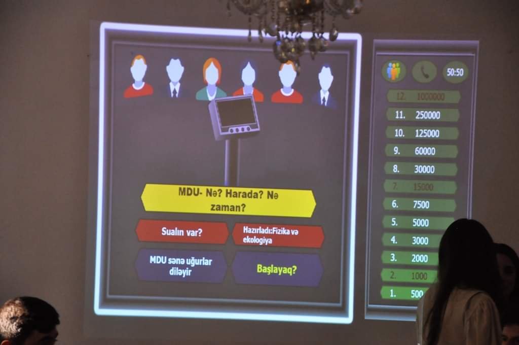 Mingəçevir Dövlət Universitetinin (MDU) Fizika və ekologiya kafedrasının təşkilatçılığı ilə Mingəçevir şəhərinin 75 illik yubileyi münasibətilə “Nə? Harada? Nə Zaman?” intellektual oyunu formatında bilik yarışı keçirilib.