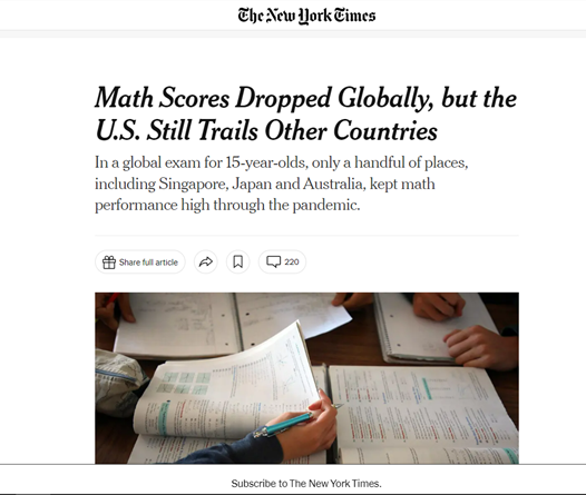tehsilmedia.info xəbər verir ki, 2023-cü il 5 dekabr tarixində dərc edilmiş PISA 2022 beynəlxalq qiymətləndirmə tədqiqatının hesabatlarında əksər Avropa və Amerika ölkələrində şagirdlərin riyaziyyat, oxu və təbiət elmləri üzrə göstəriciləri zəifləyib.
