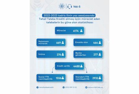 Təhsil Tələbə Krediti Fondundan "tehsilmedia.info"a bildirilib ki, bu günə qədər 6174 tələbə kredit almaq üçün müraciət edib. Onlardan 669 nəfərin müraciəti natamam olub, 464 nəfərin müraciəti emal mərhələsindədir. Habelə 276 nəfərin müraciətinə imtina cavabı verilib, 277 nəfərin müraciəti isə banka yönləndirilib.