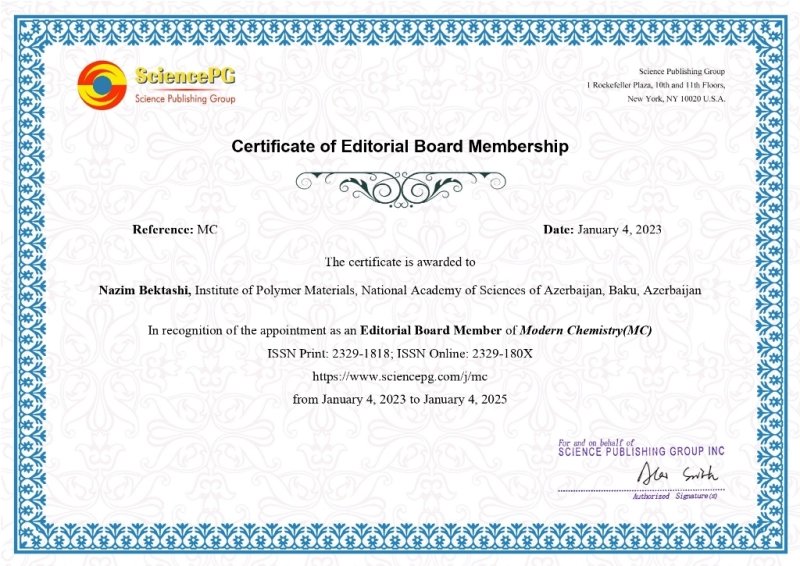 Elm və Təhsil Nazirliyinin Polimer Materialları İnstitutunun Fiziki - kimyəvi analiz şöbəsinin aparıcı еlmi işçisi, kimya üzrə fəlsəfə doktoru, dosent Nazimhikmət Bektaşi "Science Publishing Group” (SciencePG) nəşriyyatında dərc olunan "Modern Chemistry” jurnalının redaksiya heyətinin üzvü seçilib.