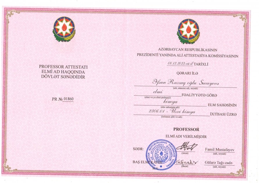 Azərbaycan Respublikası Prezidenti yanında Ali Attestasiya Komissiyasının qərarı ilə Elm və Təhsil Nazirliyinin akademik Əli Quliyev adına Aşqarlar Kimyası İnstitutunun icraçı direktoru kimya elmləri doktoru Əfsun Sucayev kimya elm sahəsi üzrə 2306.01- Üzvi kimya ixtisasından professor elmi adına layiq görülüb.