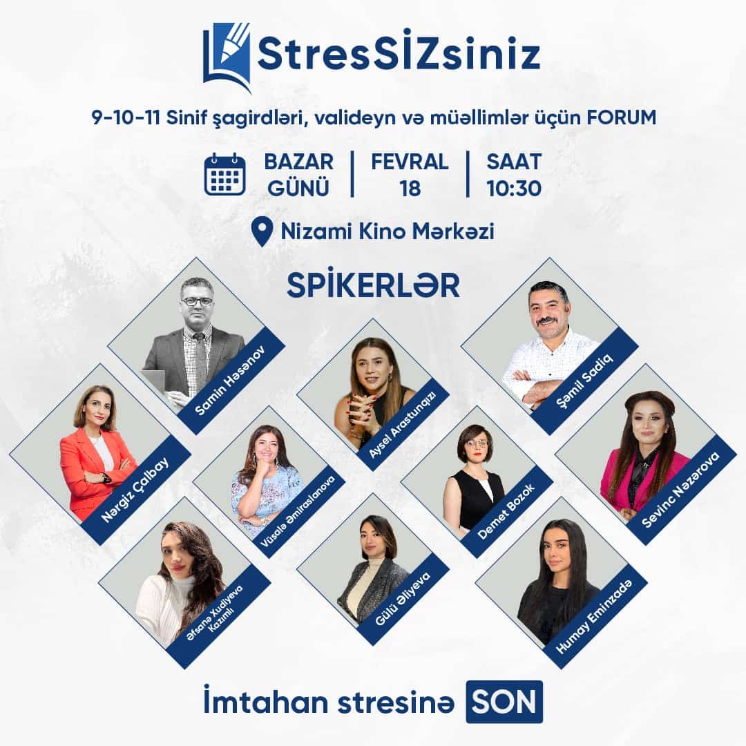 Eyni zamanda forum iştirakçılarına yerli və türkiyəli təlimçilər tərəfindən imtahana hazırlaşarkən vaxtın düzgün bölünməsi, psixoloji və fiziki sağlamlığın peşəkar izlənməsi sirrləri də veriləcəkdir.
